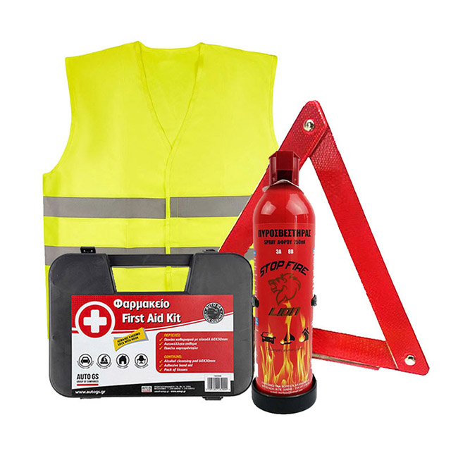 Σετ Ασφαλείας Αυτοκινήτου / Σετ ΚΤΕΟ Τρίγωνο, Φαρμακείο, Πυροσβεστήρας 750 ml, Γιλέκο Κίτρινο