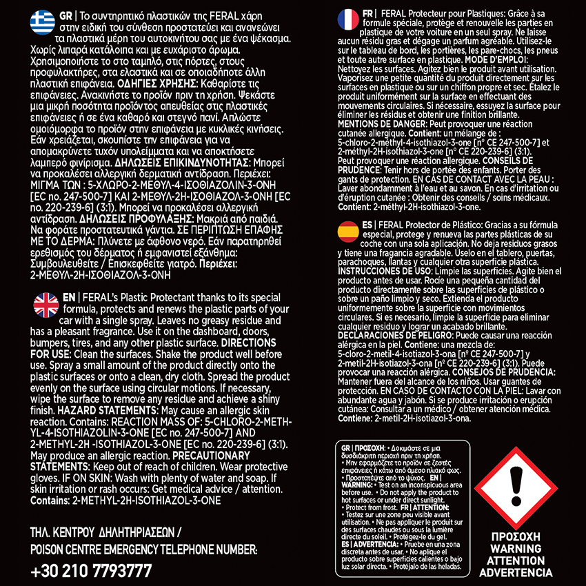 Το Γυαλιστικό Και Συντηρητικό Γαλάκτωμα Πλαστικών Feral Detailing Pro χάρη στην ειδική του σύνθεση προστατεύει και ανανεώνει τα πλαστικά μέρη του αυτοκινήτου σας με ένα ψέκασμα και διαθέτει ευχάριστο άρωμα. Χρησιμοποιήστε το στο ταμπλό, στις πόρτες, στους προφυλακτήρες και σε οποιαδήποτε άλλη πλαστική επιφάνεια.