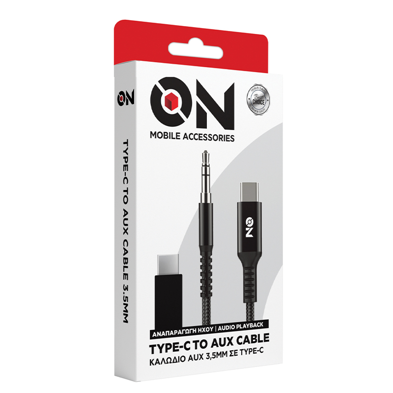 Το καλώδιο AUX 3.5mm σε Type-C της ON Mobile Accessories επιτρέπει τη σύνδεση συσκευών χωρίς θύρα 3.5mm σε ενισχυτές, ακουστικά, ηχεία αυτοκινήτου και κάθε συσκευή με υποδοχή AUX. Ιδανικό για ακρόαση μουσικής στο αυτοκίνητο, στο σπίτι ή εν κινήσει.