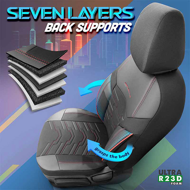 Extra Supportive 7 Layers: Ορθοπεδικός σχεδιασμός 7 στρώσεων στα πλαϊνά ώστε να παρέχεται στήριξη στην πλάτη και τη μέση. Προλαμβάνει τον πόνο και αυξάνει την οδηγική άνεση.