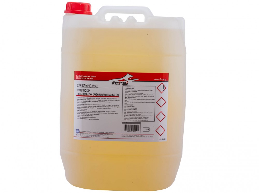 Το Στεγνωτικό Κερί Feral είναι ένα ειδικά σχεδιασμένο υδόφοβο προϊόν, το οποίο προσφέρει συγχρόνως απόλυτο γυάλισμα και λάμψη, χωρίς να θολώνει τα τζάμια. Κατάλληλο για αυτόματες βούρτσες, αλλά και για πλύσιμο στο χέρι με τη χρήση ενός δοχείου ψεκασμού.